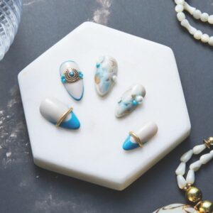 Dazzle and delight with this hidden turquoise marble gel nail art design, which can be recreated in nine steps. Kim…