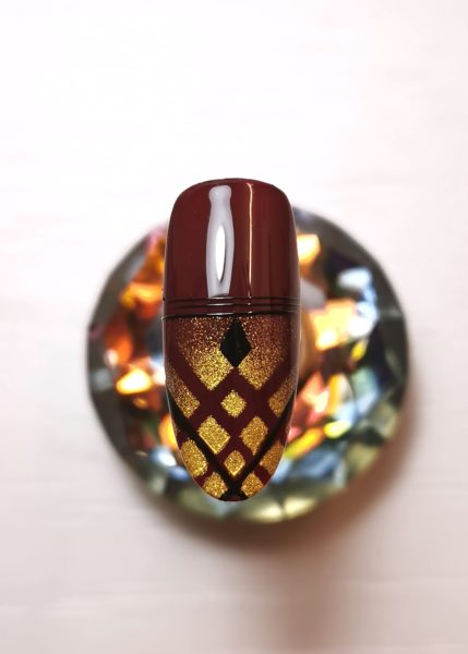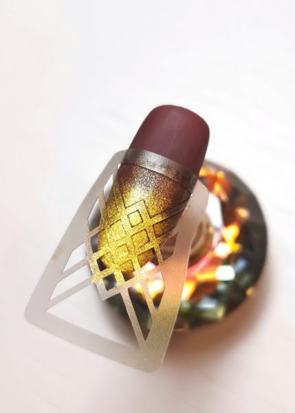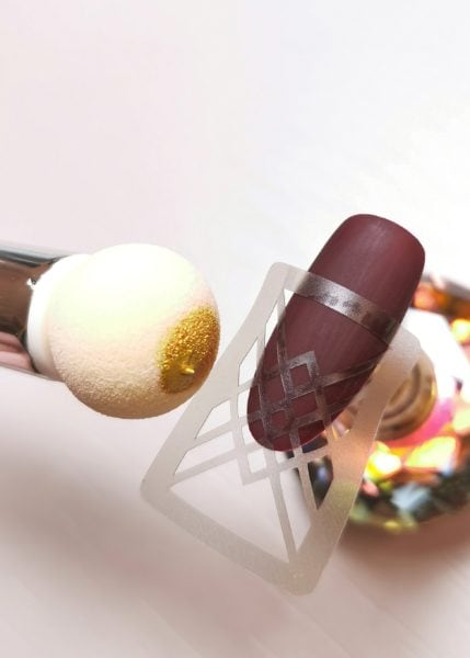 With the help of the Aeropuffing Puffing Sponge, I applied gold gel paint over the stencil. Carefully remove the stencil and cure the design in LED/UV light (30 seconds/2 minutes).