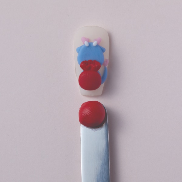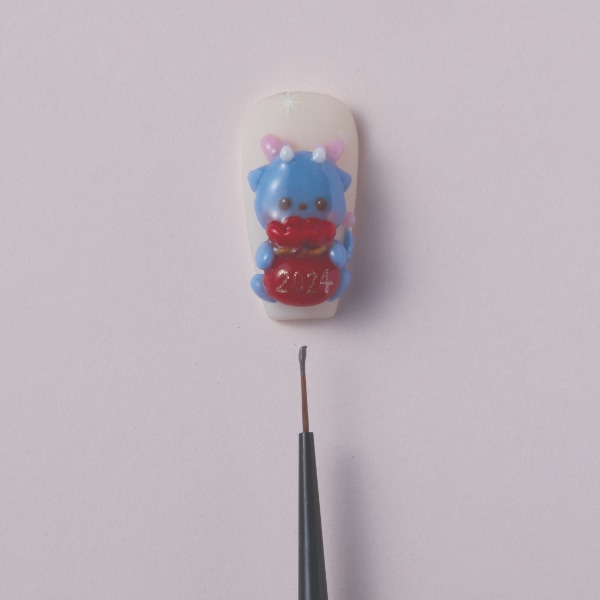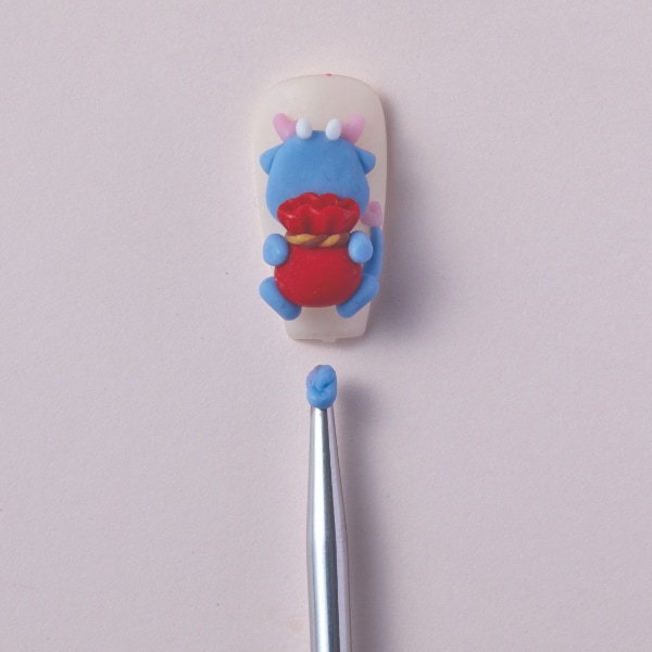 Complete the lucky pouch using brown and orange 3D gel and cure. Using the same blue 3D gel from steps five and six, design the hands and feet of the dragon and cure.