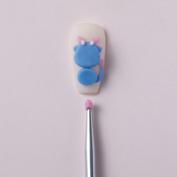 Using a small amount of pink and white 3D gel with a spatula, create horns and a tail end and cure.