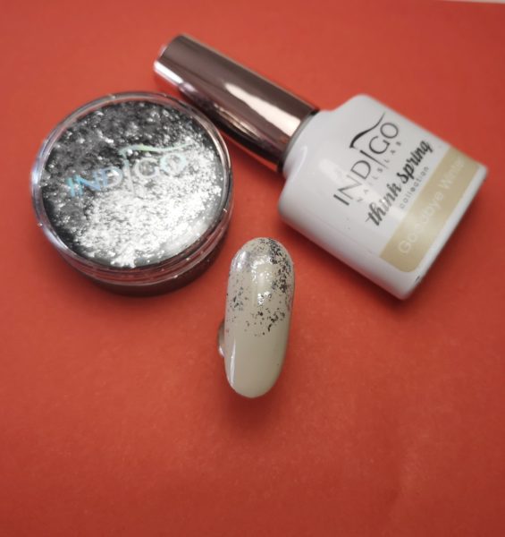 Prep the nail. Apply Indigo Nails Lab gel polish in Goodbye Winter. Cure and apply a small amount of Flame Effect Moonlight nail art flakes.