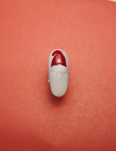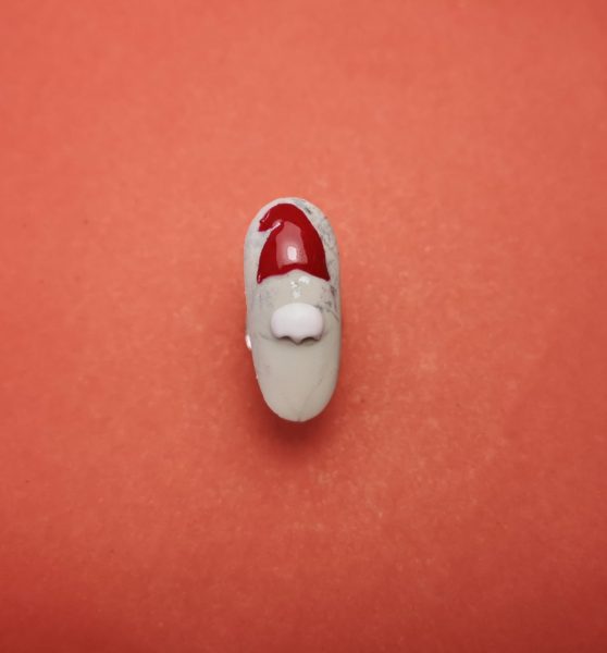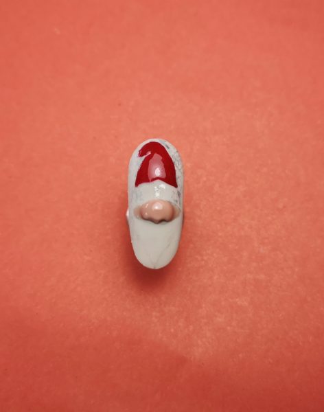 To create the shadow on Santa's hat, use the Black Ghost gel polish. Place another curl made with Art Gum on the end of the hat. Apply Tip Top top coat to the hat.