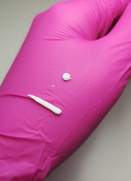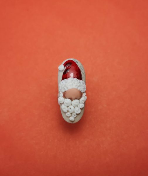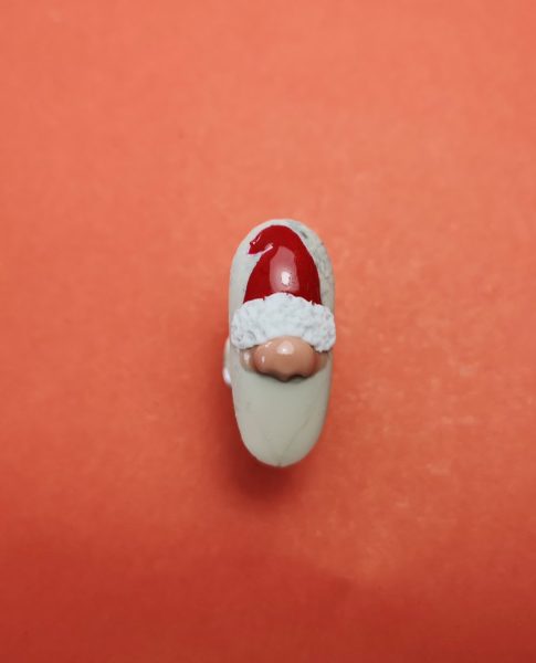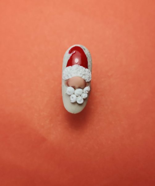On Santa’s nose apply Super Matte top coat and cure. Using a small amount of Indigo Art Gum White Rose form curls and place it as Santa's beard.