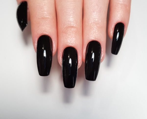 Prepare nails for a gel polish application. Apply a layer of black gel polish to all nails. Cure and repeat if needed