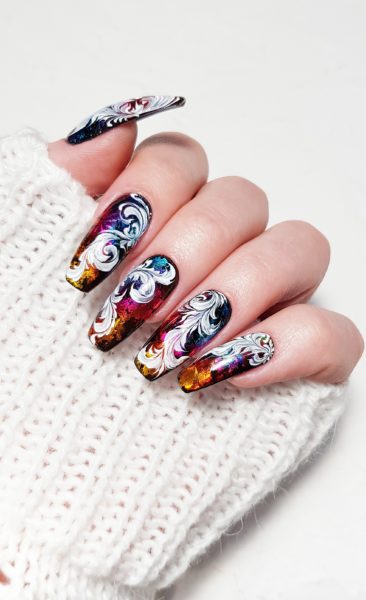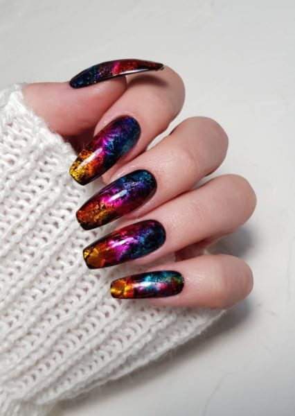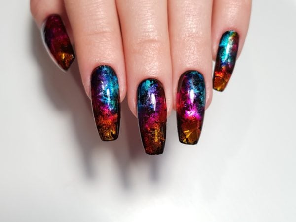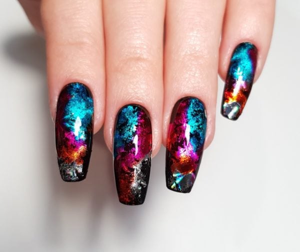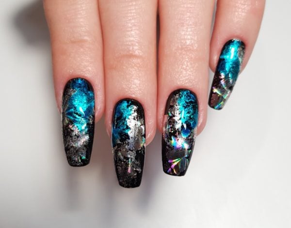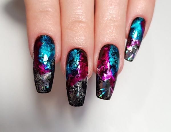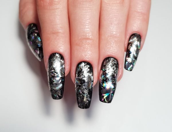 Apply silver holographic foil across the nail in patches.