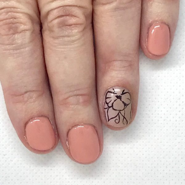 Using a Mini Striper Brush and Gelish Art Form Gel in Black, paint an outline of the flower, leaves and stems. Cure for 30 seconds.