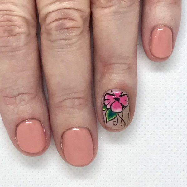 Using the Mini Striper Brush, blend the flower petals to create an ombre effect. Repeat thestep to blend the leaves. With Gelish Art Form Gel in Essential White and the Mini Striper Brush, create highlights on the petals and leaves. Continue adding additional designs. Cure for 30 seconds. Apply Gelish Top It Off to the entire nail making sure to cap the free edge. Cure for 30 seconds. With Nail Surface Cleanse and Wipe It Off lint-free wipes, cleanse the inhibition layer of the nail.