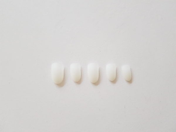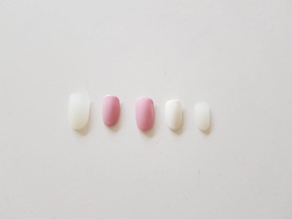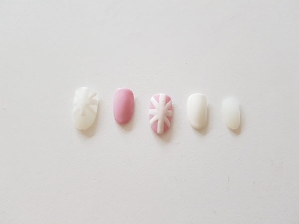 Using Gellux Cherry Blossom, paint half the thumb nail and then on the ring finger paint a rectangle shape at the free edge of the nail and then cure.