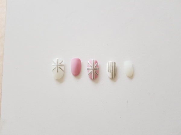 Inside the small rectangular box on the ring finger, create your small stars in a line. Make sure the stars have five points, not six. Cure. Using Gellux Purely White, apply fine lines all the way across the pinky finger then cure using a thin striping brush.