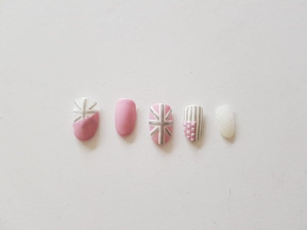 Using the thin details brush, draw the lines inside of the white lines using Gellux Silver Lining onto the thumb and middle finger then on the ring finger apply your stripes to start creating the American flag design. Cure.