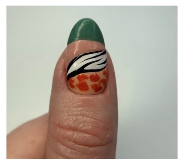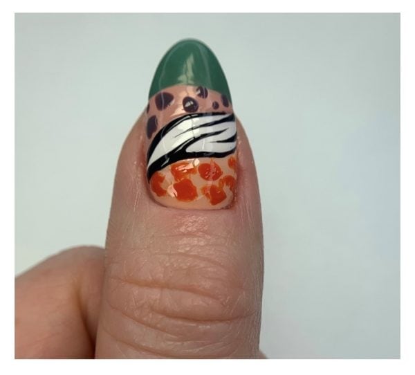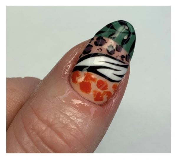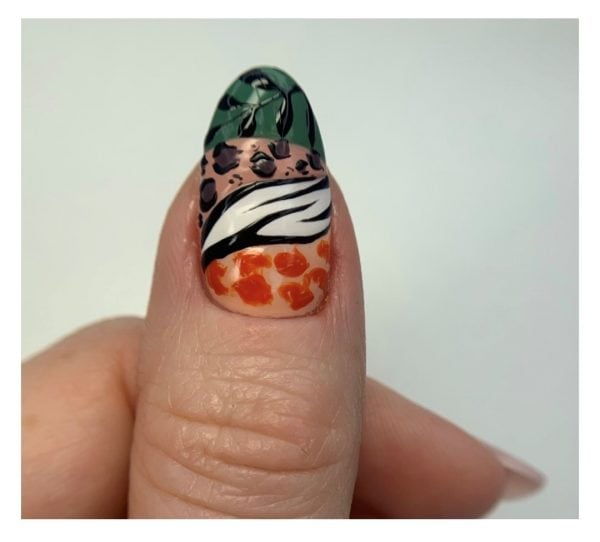 For the three animal themed nails on each hand, use a fine liner brush and GELLUX Untamed to colour the cuticle section of the nail. Apply two coats, curing in between.