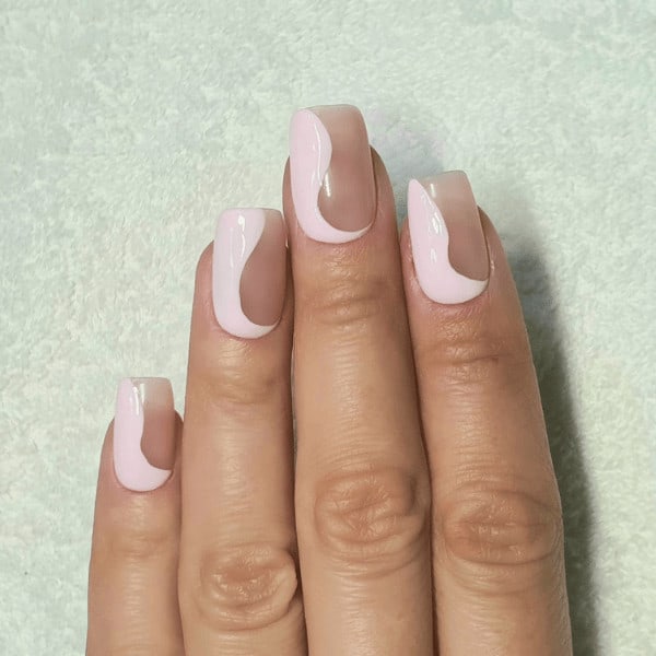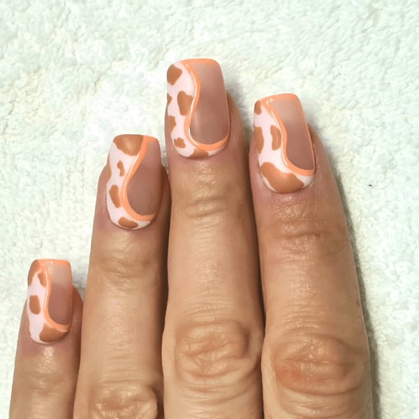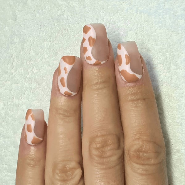 Using a detailing brush or dotting tool, create the cow print design on the baby pink areas using a brown gel polish hue. Apply the print randomly and do not make the shapes even in size and style. Cure. Apply a matte top coat and cure.