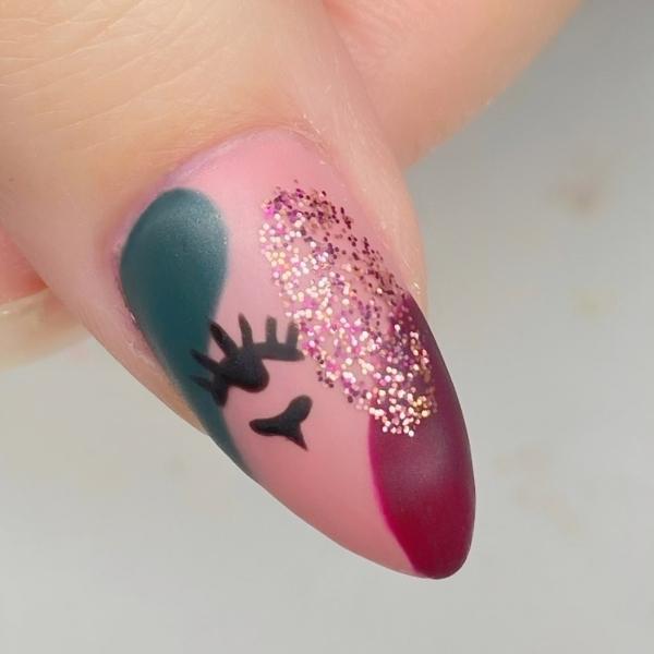 Use the #1 Bling Stylus Tool and dot in the centre of the larger crescent to make an eye. Create wispy lashes with the Stripy Brush using a small amount of gel paint then cure before adding a top coat with either Flat Matte or Super Shiny. Cure to complete the design