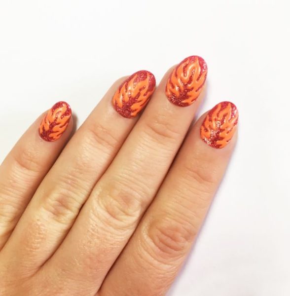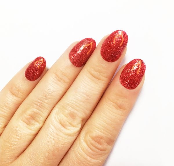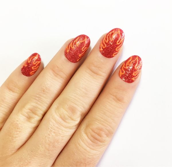 Thicken the inside of the flame outlines with Flip Flop by Barry M and a fine detailer brush, leaving a flame shaped space of red glitter in the middle and at the tip of each nail.