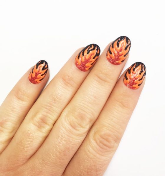 Using a fine detailer brush and Flip Flop by Barry M, paint on a linear tip of a flame at each nail tip.