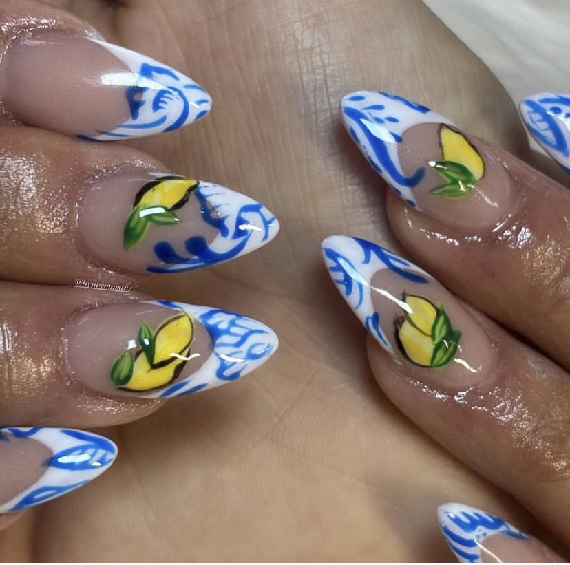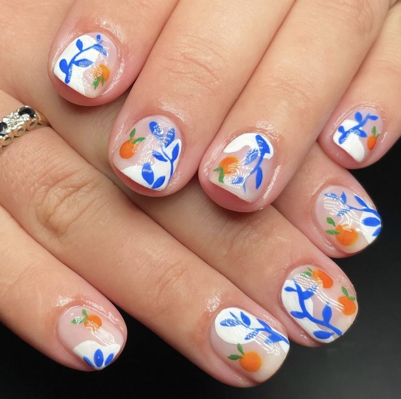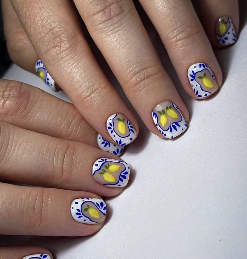 Amalfi-inspired nails are popping up all over our socials. The ideal holiday manicure boasts a Mediterranean colour palette of blues and white, and often features zesty oranges, lemons and tile prints paying homage to the Italian location.