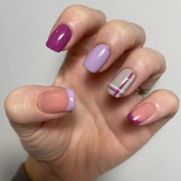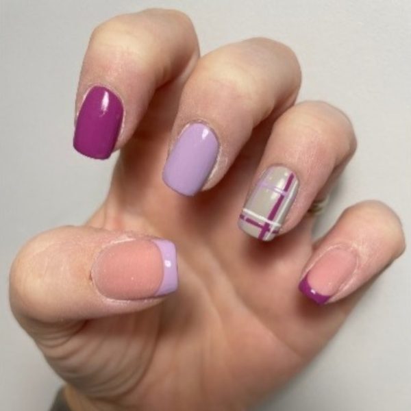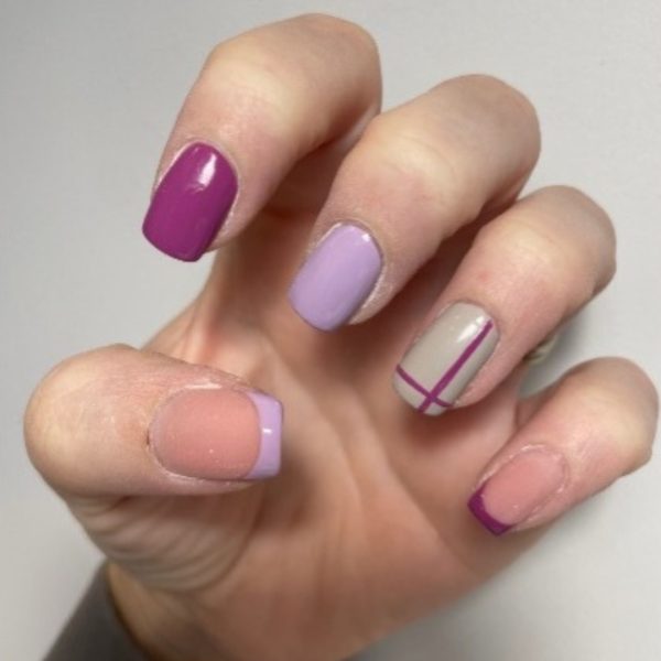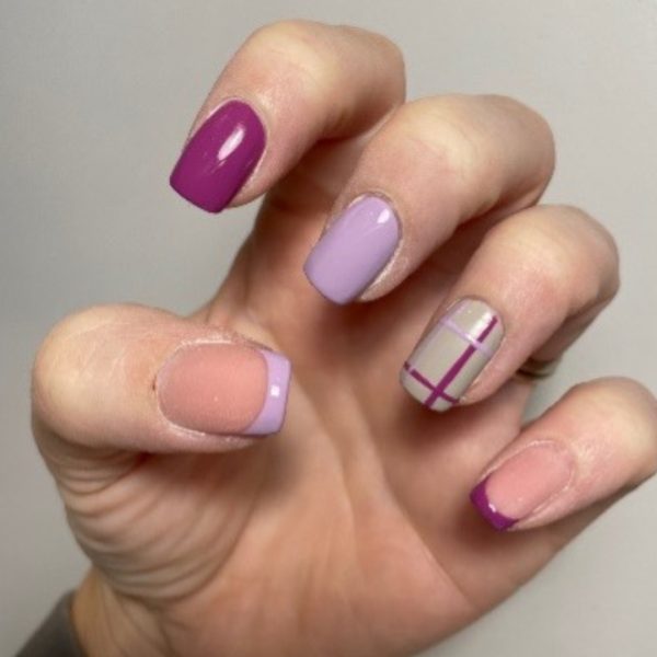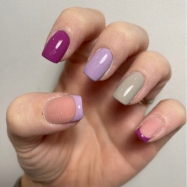 Apply two coats of GELLUX Mini, Dusty Lilac, to the middle finger and using a thin liner brush, create a French tip with the colour on the thumb. Apply two coats of GELLUX Mini, Plumberry, to the index finger and use the shade to create a French tip on the pinky. Then, apply two coats of GELLUX Mini, Absolute Greige, to the ring finger. For each layer of colour, cure for 60 seconds.