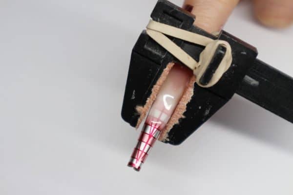 Flash cure for three to five seconds in your LED lamp, then use a pinching tool to pinch the nail, followed by applying a pinching clip to hold the C-curve as it cures for the full 30 seconds in the LED lamp.