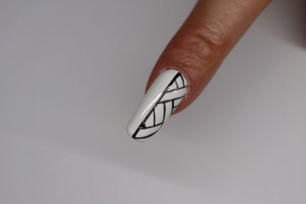 Create an abstract design to one half of the nail using black gel a and a Light Elegance Stripey brush. Cure for 30 seconds in LED light.