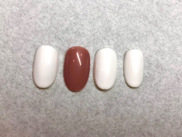 Paint the index, ring and little finger with two layers of Gellux Purely White, curing in between coats. Paint the middle finger with one layer of Gellux Bare Necessities, cure.