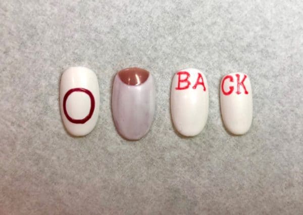 Using a detail brush and Gellux Serengeti Sunrise, create a circle on the index finger. Apply Gellux Purely White to the middle finger leaving a nude half-moon. Then dip a detail brush into Gellux Toucan Tango and paint the letters 'B' and 'A' on the ring finger and 'C' and 'K' on the little. Cure all fingers.