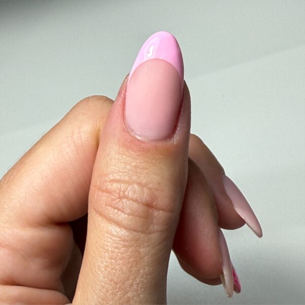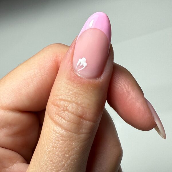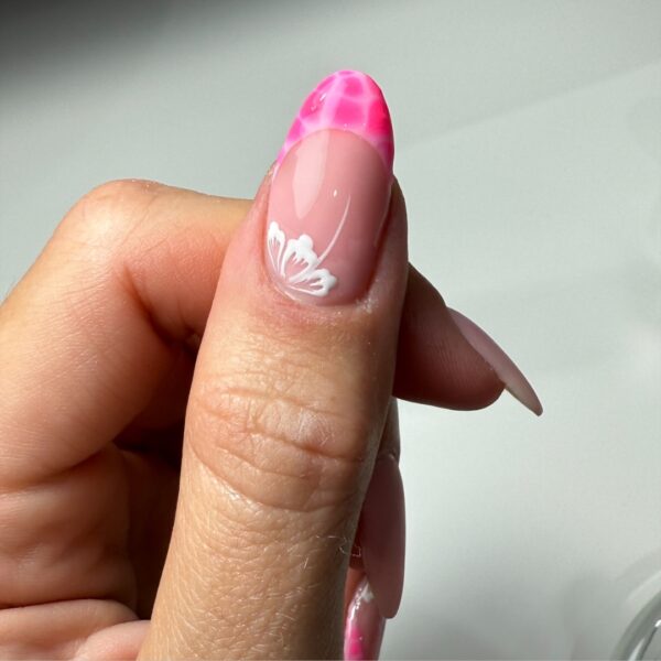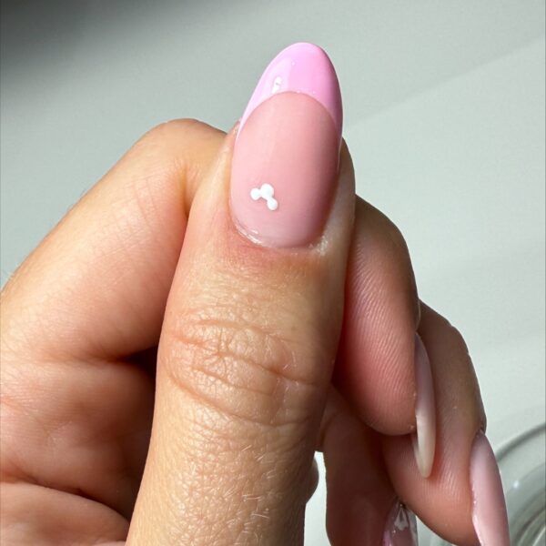 Apply blooming gel over the French tip in a thin layer. Do not cure. Take a contrasting gel polish colour of your choice and use a dotting tool to dot it in the blooming gel, not getting too close to the smile line. Once happy with how the colour has spread, cure.