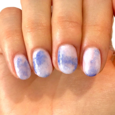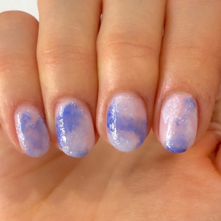 Using a makeup sponge applicator, or nail art sponge brush, dab some GELLUX Stormy and GELLUX Mermaid randomly onto the nails, and cure.