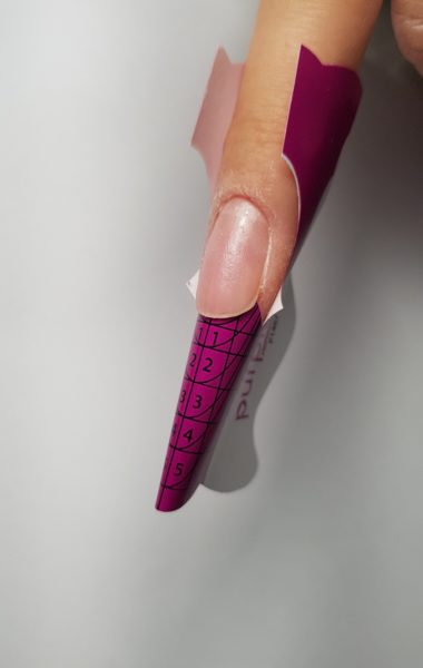 Prep the nails for enhancements and file the free edge. Buff the surface of the nail with a 180 or 240-grit buffer and remove dust with a dust brush. Fir the nail form and apply Jana Nails Magic Airbond 3 in 1 followed by Ultra Sticky Acid-Free Nail Primer. Allow the primer to air-dry for two minutes.