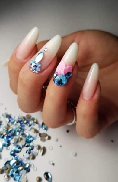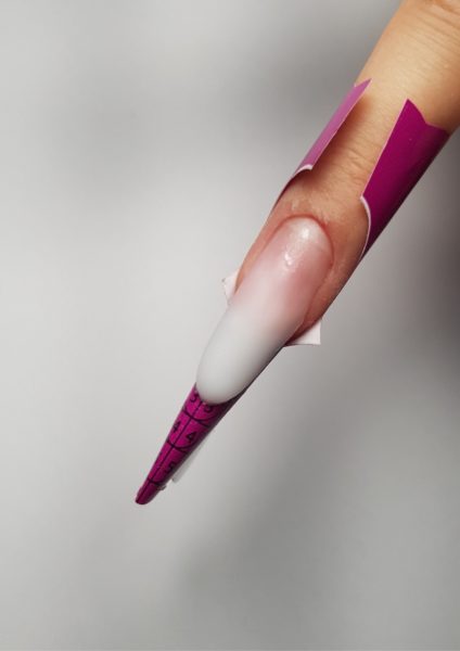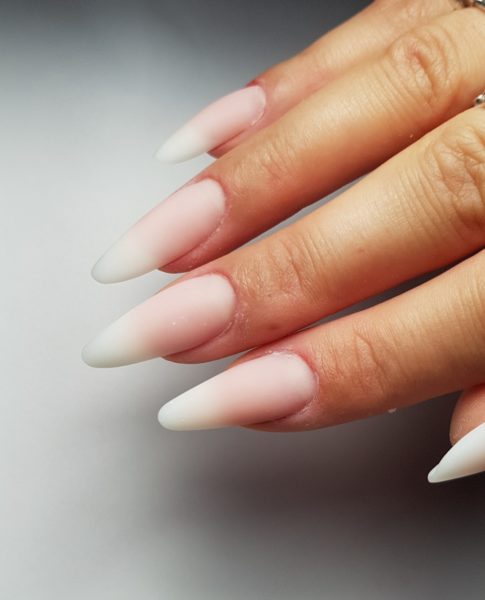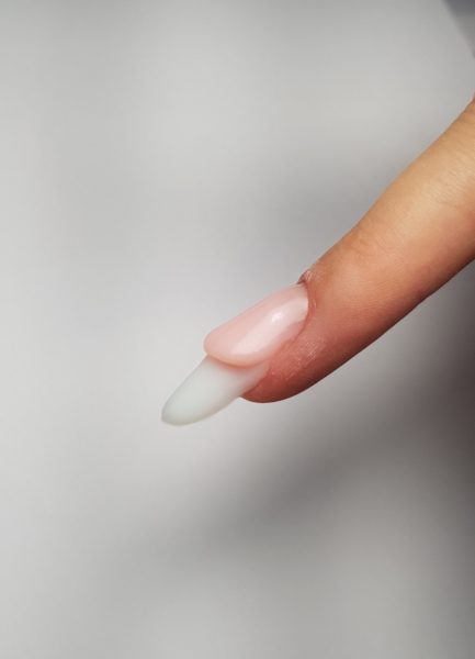 Apply a very thin layer of Base UV Gel in Miracle Pink and cure for one minute. Using the AcryGel Double Brush, take a pea-sized amount of AcryGel in Milky White and apply closely to the free edfe. Work the product to create a faded effect towards the middle of the nail, creating the extension shape on the nail form. I chose a classic almond shape. Cure for one minute when happy with the result.