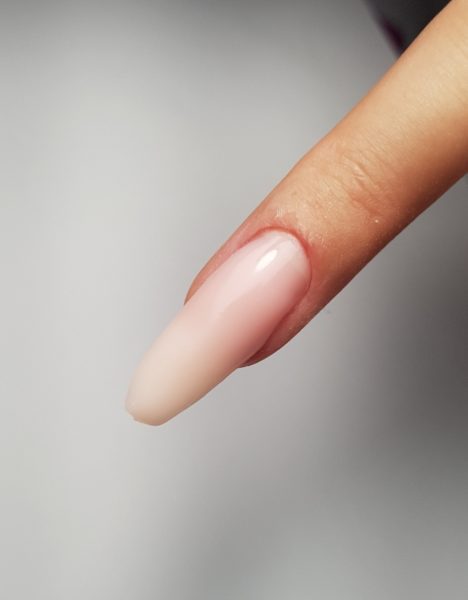 Next, take a pea-sized amount of AcryGel in Milky Pink and apply on the faded area at the middle to the cuticle area of the nail. Work from the cuticle area up to the free edge and cure for one minute.