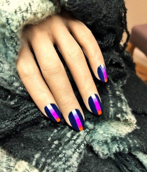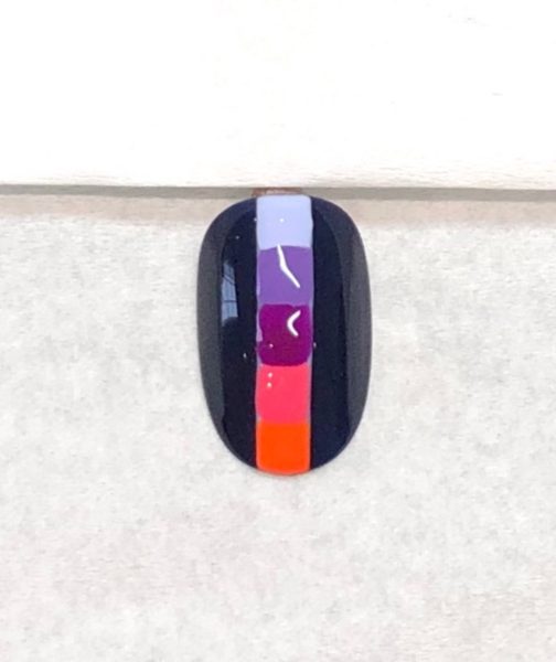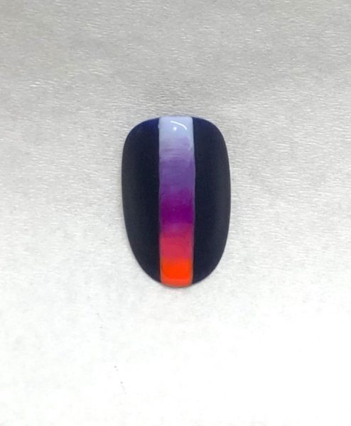 Using a detail brush, apply the Gellux Minis in colours Stormy, Lavish Lilac, Berry Burst, Watermelon and Orange-A-Peel starting from the top going down the bottom of the middle stripe. Do not cure.