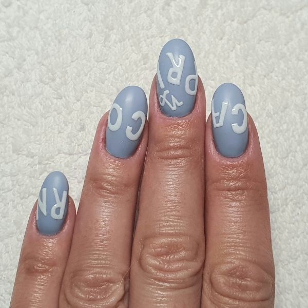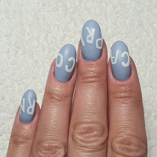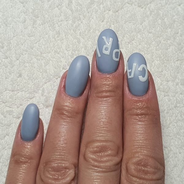 Prepare the nails, file to shape, push back the cuticle and gently buff the nail plate. Brush away any dust and wipe over with GELLUX Prep + Wipe. Apply GELLUX Fast Bond and let it dry. Apply a thin coat of GELLUX Cover Easy Off Base Coat to the nails, making sure to cap the free edge and cure. Then, apply a thin coat of GELLUX Stoney Blue and cure, repeating with a second coat, again making sure to cap the edges.