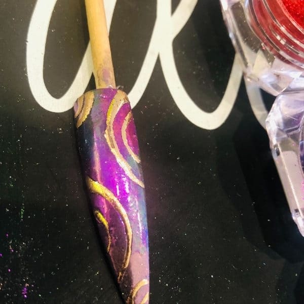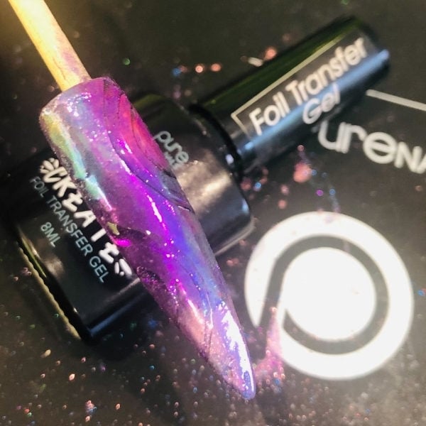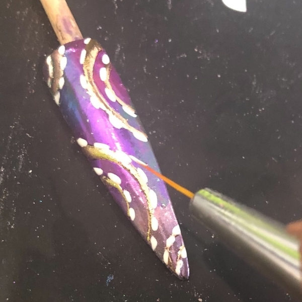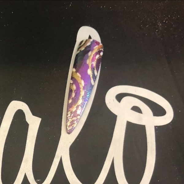 Using Halo Foil Transfer Gel draw in circular motions like a Catherine Wheel with a fine liner brush. Cure for 45 seconds.