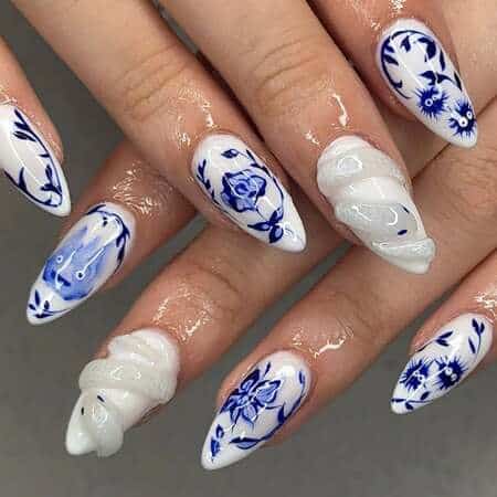 Porcelain or china-inspired nail art captures the delicate beauty of traditional blue and white ceramic patterns, often inspired by Ming dynasty porcelain.