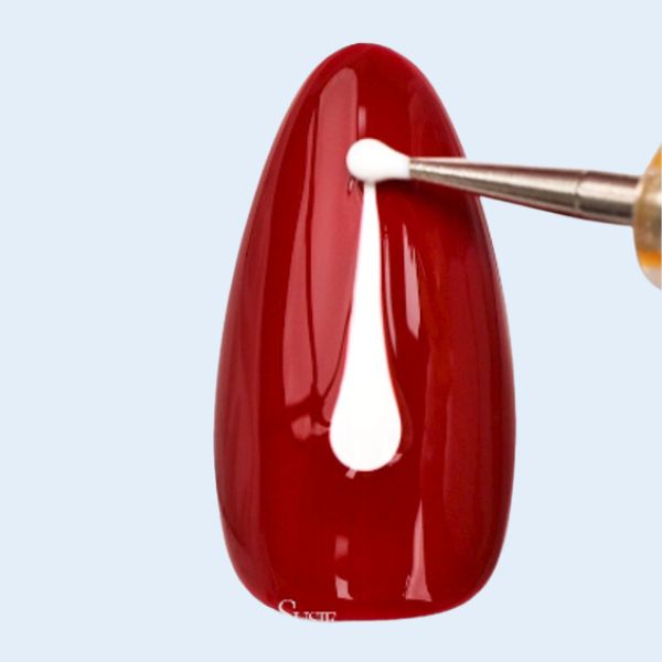 Apply a base colour of Melody Susie Fleurwee Plant-based Gel Nail Polish in Rose Red. Cure under a UV/LED lamp for 60 seconds. Apply a second layer of Rose Red - but do not cure. This helps to create a smooth base for the next steps, on which colour can be blended. Paint a vertical line from the bottom to the top of the nail using Fleurwee Plant-based Gel Nail Polish in Camellia White and a dotting tool. Do not cure.