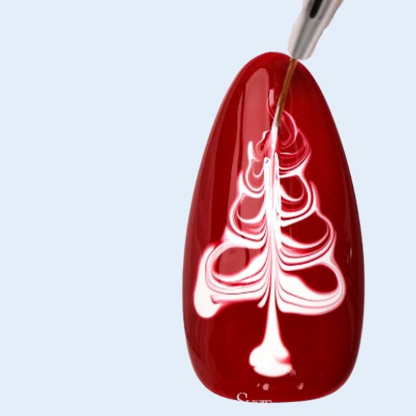 Using a nail art liner brush or dotting pen, paint the outline of the Christmas tree. Start with a triangle shape for the tree base, tapering towards the top in a circular path.