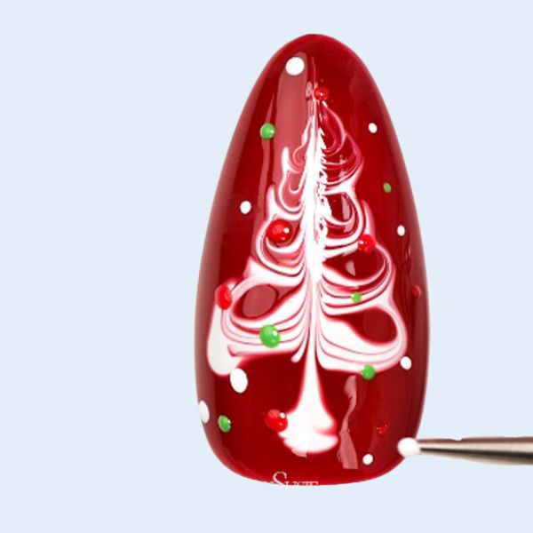 The team at Melody Susie shares how to create this festive red and white Christmas tree nail design in five steps.