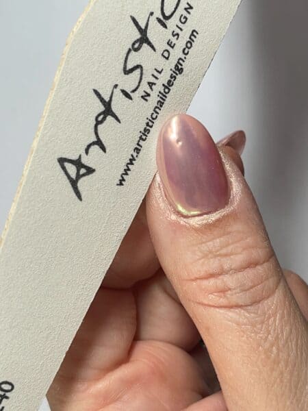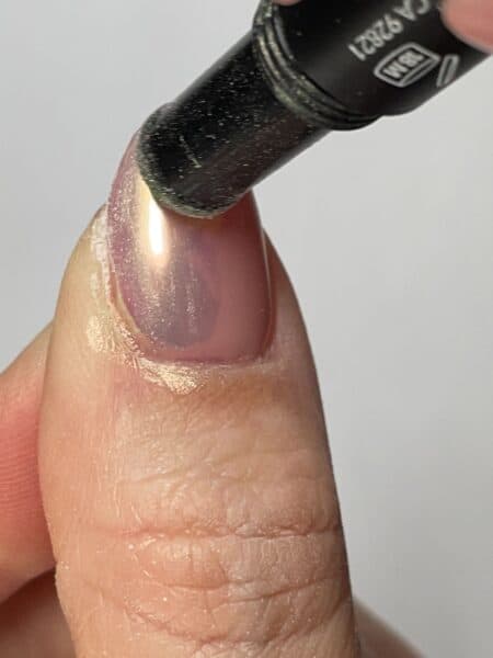 Once the whole nail is covered gently file around the free edge to remove any loose powder. Cure for another 30 seconds. This helps to bond the powder into the Chrome Gloss a little more.