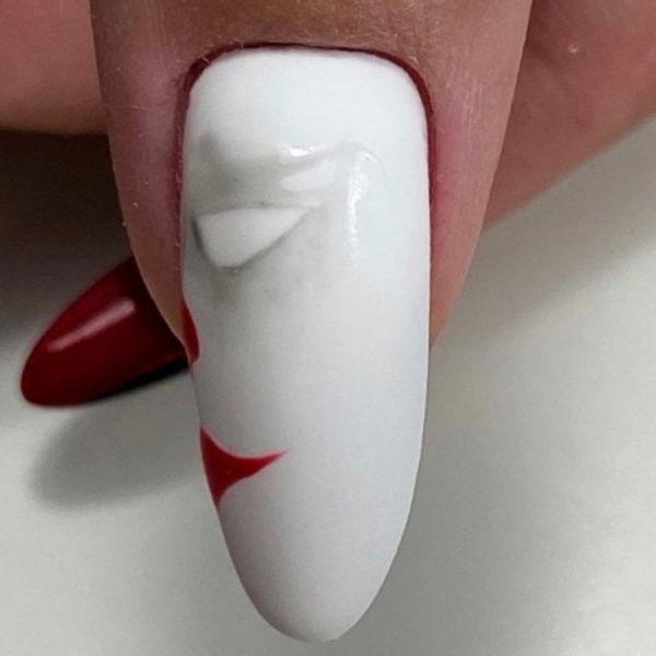 Apply Indigo Nails Mr. White Gel polish to prepped nails and cure for 30 seconds. Make the thumbnail matte with a buffer and paint eyes using a thin brush and Indigo Nails Black Ghost Gel Polish from the Glass Collection. Draw the nose and lips using Indigo Nails Fireman Gel Polish, and cure in the lamp for 30 seconds.