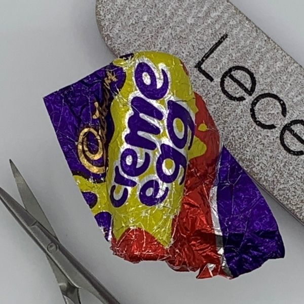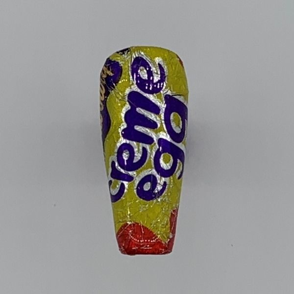 Lay the Creme Egg wrapper on the nail and firmly glide your finger over to adhere. Trim any excess wrapper and tailor the back edge.