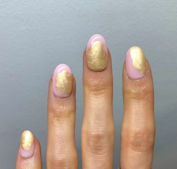 Then, start to paint random patches of Salon System Gellux in Goldmine on each nail and cure.