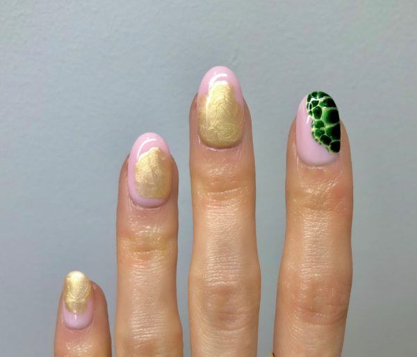 Now dip a fine brush or medium liner in Salon System Gellux in Gold Rush and outline the edges of the crocodile patches, cure again.