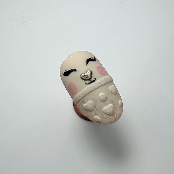 Paint lashes and the mouth with tack-free black gel paint. Mix pink pigment powder or pink gel with a no-wipe top coat to make a glassy pink gel, and paint rosy red cheeks. If the cheeks look tacky when cured, apply no-wipe top coat to them.