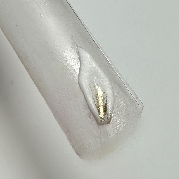 Craft 3D ears using white L&P acrylic on an Arabella form. Apply gold metallic details and adhere to the nail.