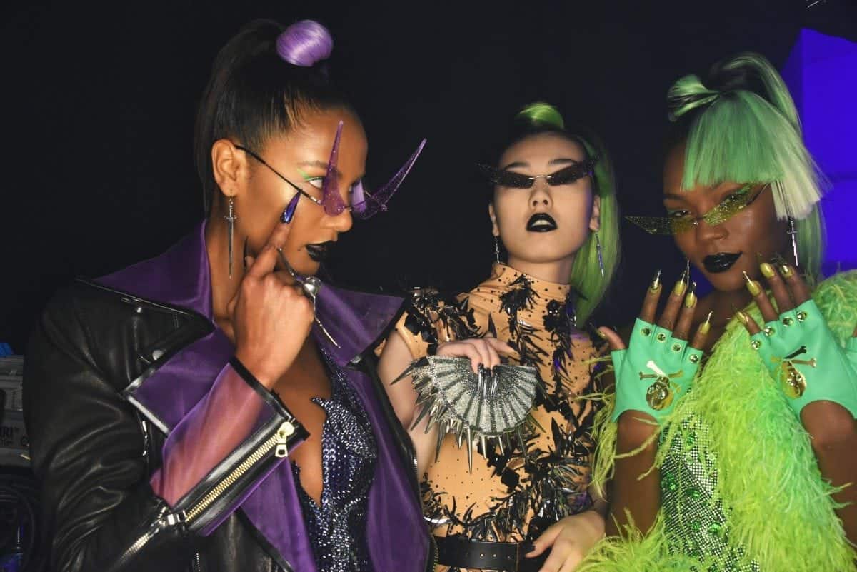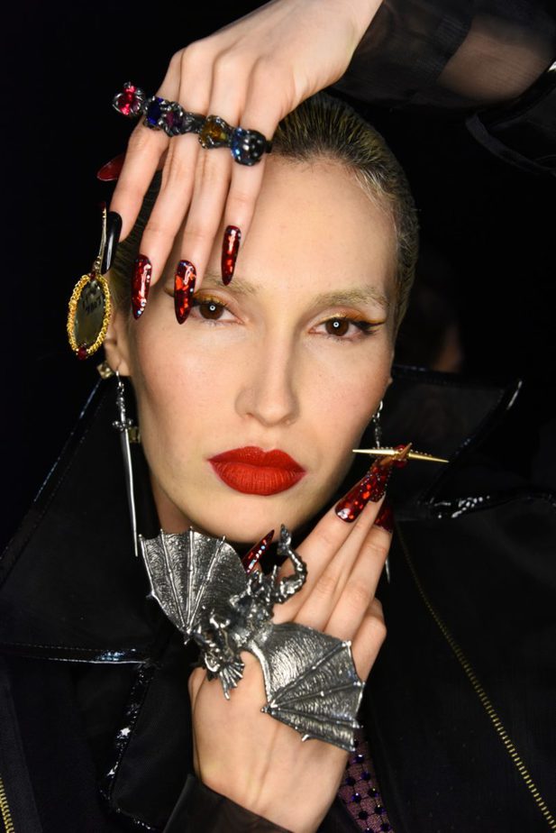 Nails were long and many razor-sharp with stiletto tips to convey danger. Bold textures mixed to create the finished looks; including sleek, eel-like skin, reflective metallic fragments and 3D embellishments.