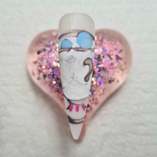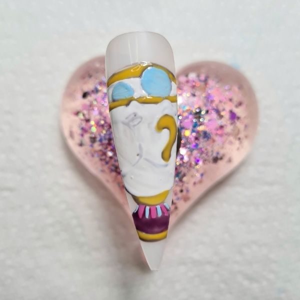 Add the white to colour the body of the cup, blue for bubbles inside the cup, and begin the art colours on the stand of the cup on Chip's feet.