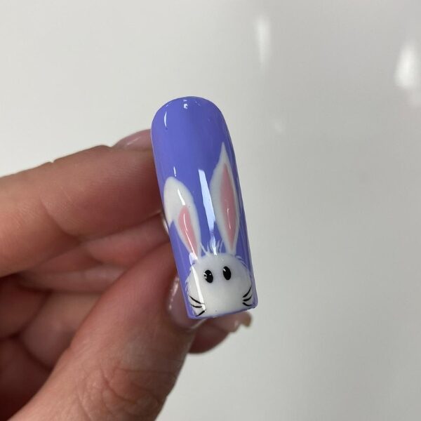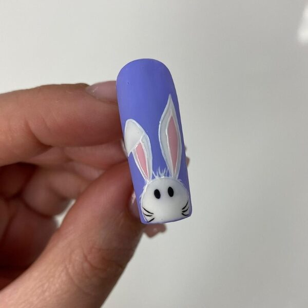 Add small hairs around the bunny’s face using the white shade and cure. Dot in the bunny eyes and lightly paint the whiskers using a black hue, then cure. I used Unbelievabel Gel in Black. Finish this step by top coating and curing again.