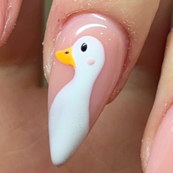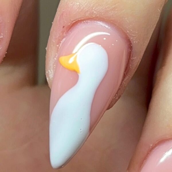 Mix Gel Polishes in Clay and French White to create a subtle yet noticeable colour. Near the base of the goose's body, create a heart-like shape for the feet. Cure.