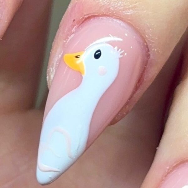After prepping the nail and applying a base of Halo Acrylic Powder in Blush Pink, create the goose shape using Gel Polish in French White. Use the Dotting Tool to make the rounded edges more precise, and the Create Combo Brush to help neaten everything up. Make sure the goose has a long neck and body. Cure once you are happy with the shape.