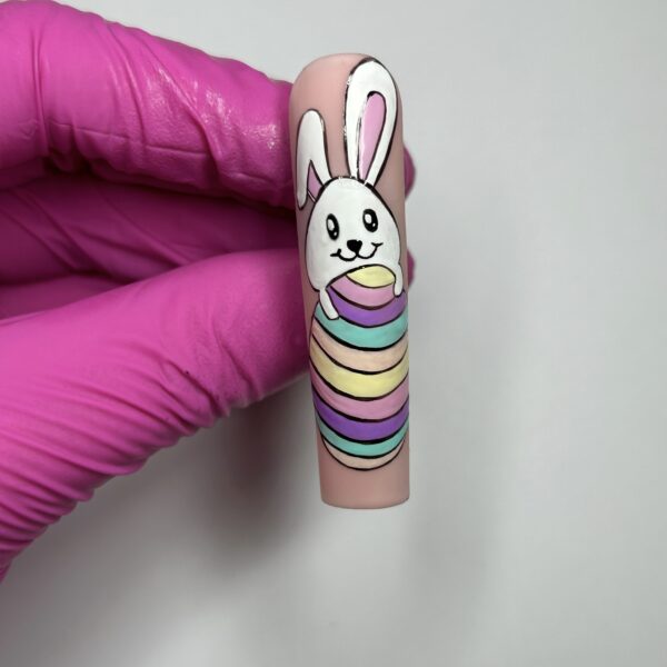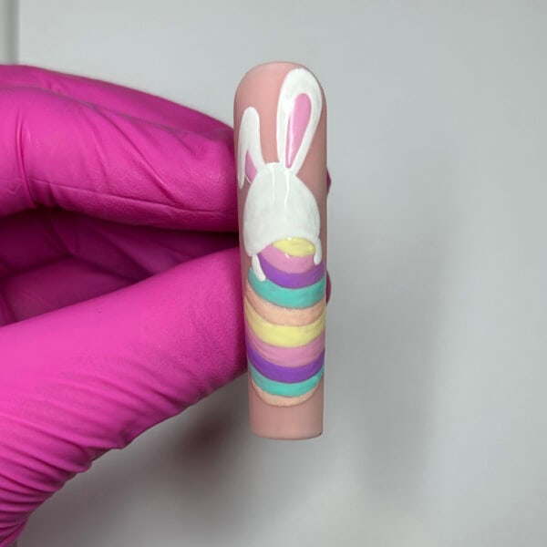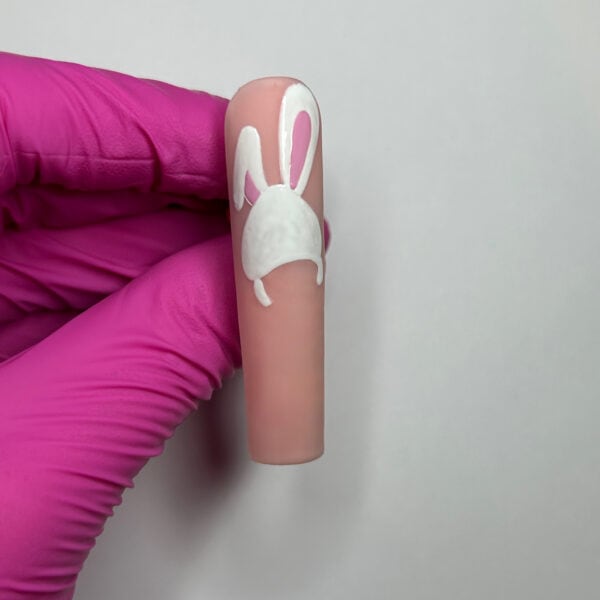 Apply two coats of Gems Full Control Gel in Jodie to the nail, curing between each coat. Apply a matte top coat and cure, then paint a curved triangle for the rabbit’s head and arms using Gems Gel Polish in Angel. Cure.
